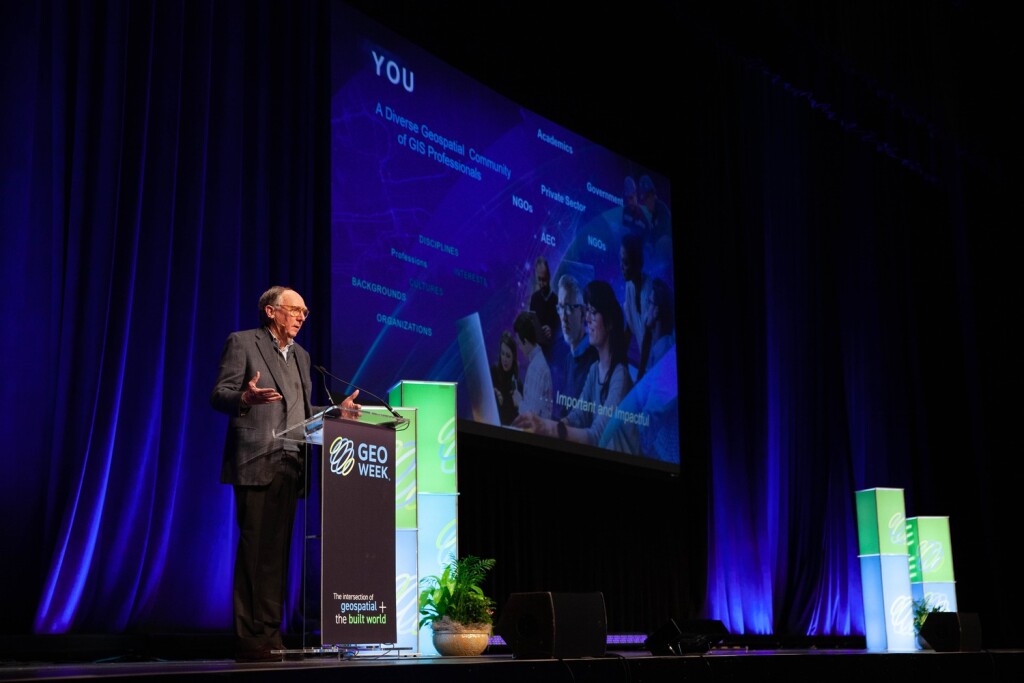 And more to the theme of this show, GIS plays a big role. Dangermond let all of the professionals in the room know their role, telling the audience, “GIS professionals have an important role in creating a sustainable world.” He talked about GIS being a “foundation for progress,” providing crucial spatial context to organizations of all sizes to help better understand how and why things are happening to in turn lead to better responses.