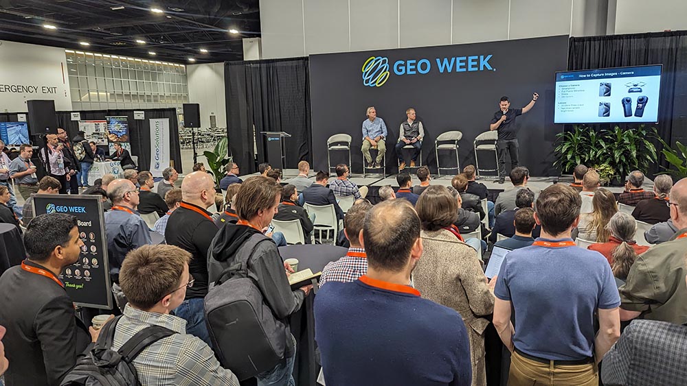 Geo Week 2024's Exhibit Hall Theater was, for the second year in a row, home to a fascinating conversation about NeRFs, this year in the “NeRFs for Geospatial and Beyond” session. This year’s discussion featured insights from Jonathan Stephens of EveryPoint, Jason Laan of Laan Labs, and Ben Stocker of Skender. Despite NeRF technology being new to the geospatial industry, it clearly caught the attention of Geo Week attendees as the exhibit hall theater overflowed with professionals eager to learn about this new 3D rendering tool.