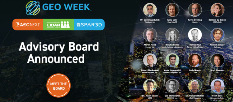 Denver, CO – February 25, 2021 – Organizers of Geo Week, the single powerhouse event that brings together AEC Next Technology Expo & Conference, International Lidar Mapping Forum, and SPAR 3D Expo & Conference, have announced an impressive list of influential leaders within the geospatial and built world industries who will be participating on the 2022 event’s Advisory Board. The Advisory Board is responsible for recommending conference topics and speakers, reviewing submitted abstracts, consulting on the program, and acting as a resource to develop different aspects of the event. The 2022 event will take place February 6–8, 2022 in Denver, Colorado.