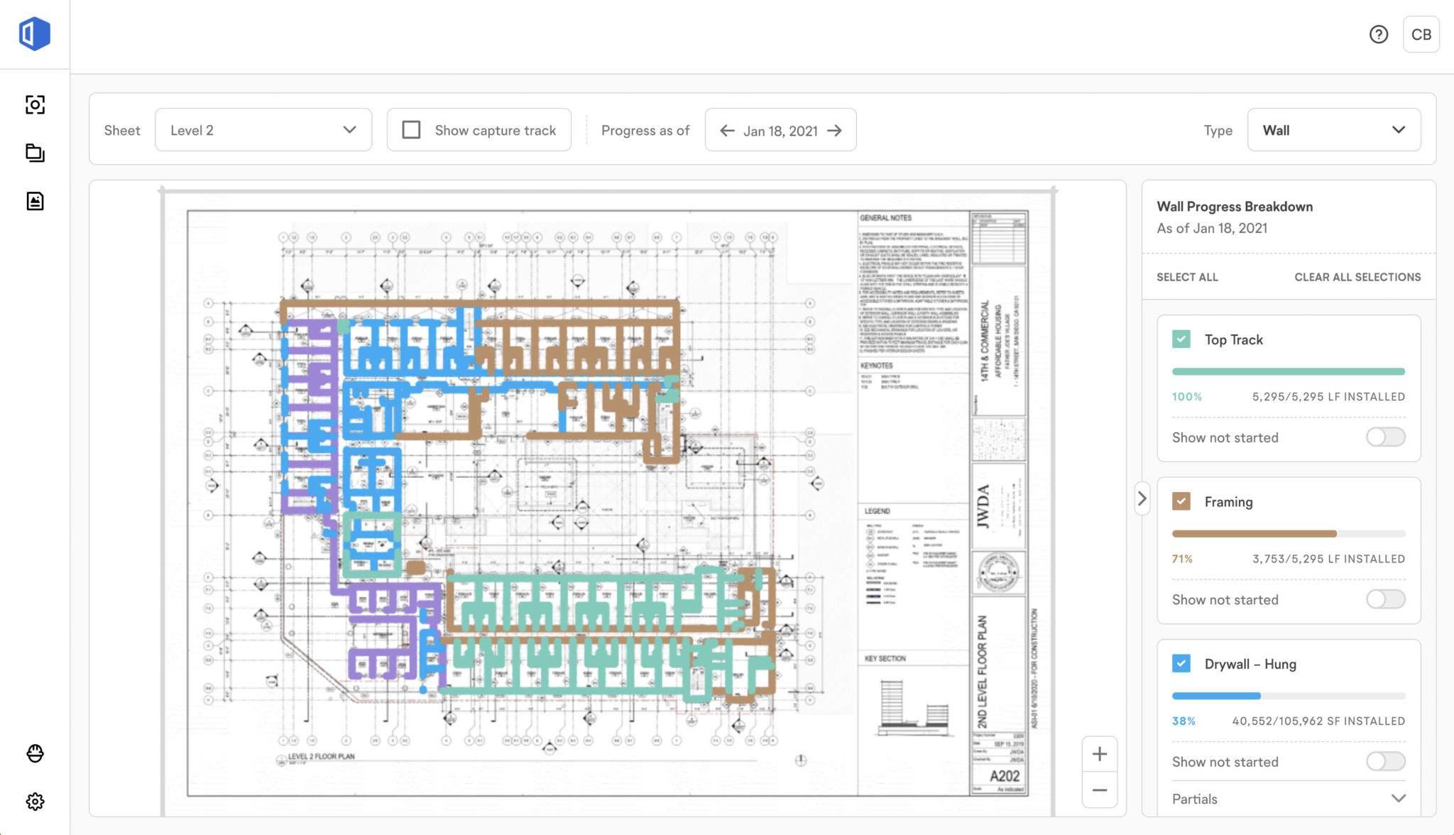 Using computer vision processes like semantic segmentation and object detection, OpenSpace Trackers are trained to recognize key elements and automatically determine what percent of planned work has been completed by builders. These insights are available within hours of image uploads as the AI compares images with takeoffs and maps the results against the floorplan.