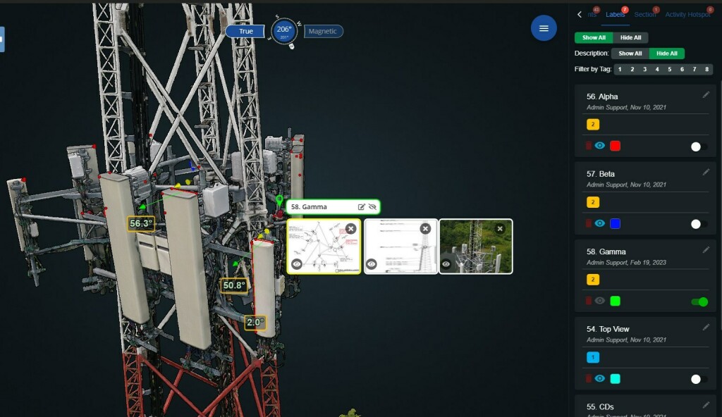 The Optelos platform manages drone data, as well as RF design specifications, construction drawings, and asset inventory, allowing all of it to be geolocated to each cell site. Taking all of that data together, the platform creates a single database for all of the data as well as an ability to create immersive 3D representations of the asset. Data is presented in their visual data management system, intuitively organizing the large amounts of data in a searchable format that can be organized however it makes sense by the user. Furthermore, they create easy and secure ways to share the data, enhancing crucial collaboration between stakeholders on a given project.